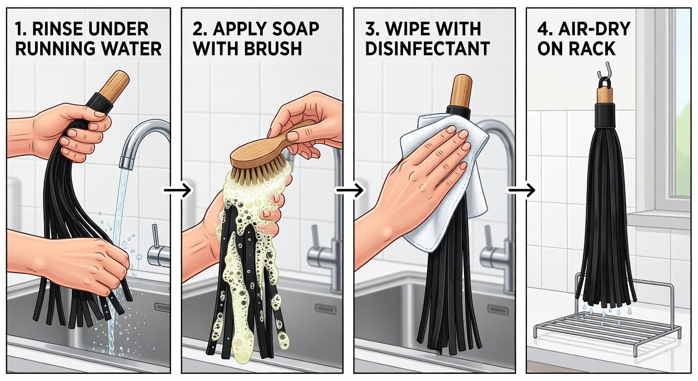 Q: How often deep clean floggers? After every heavy scene or weekly.